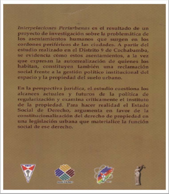 Los asentamientos humanos irregulares se constituyen, hoy en día, en uno de los fenómenos más preocupantes de nuestro medio. En los estudios que se han ocupado de ellos, se los presenta como cuestionamientos a las políticas de construcción de la ciudad; sin embargo, la forma como han sido abordados tales asentamientos, por los investigadores del Instituto de Investigaciones Jurídicas y Políticas, hace ver que las complejas relaciones subyacentes a este fenómeno requieren de enfoques más amplios que los hasta ahora desarrollados en los estudios urbanos. De hecho, ya no basta que las investigaciones se preocupen por proporcionar datos y conceptos destinados a hacer más eficientes las políticas de desarrollo urbano. En la medida en que hay una terquedad social que viene construyendo ciudades enteras por cuenta propia, no sólo en Cochabamba, sino en la mayor parte de las ciudades de América Latina, es necesario discutir bases jurídicas nuevas y principios éticopolíticos renovados, de modo tal que permitan hacer más sostenible la organización y gestión de los espacios periurbanos. En ese sentido, tal vez sean éstos una buena alternativa de encarar, con mayor sentido de equidad, a las exclusiones urbanas que hoy desdibujan el rostro de la modernidad urbana. Confiados a alcanzar resultados como éste, la Facultad de Ciencias Jurídicas y Políticas comprometió la participación de un equipo de profesionales en los proyectos concursables de la Dirección de Investigación Científica y Tecnológica y el Convenio ASDI/UMSS. Producto de ese esfuerzo es el presente libro: Interpelaciones Periurbanas: Análisis jurídico y sociopolítico de los asentamientos humanos irregulares. La Facultad de Ciencias Jurídicas y Políticas, bajo mi dirección, pondera y agradece al equipo de investigadores por la dedicación brindada en la elaboración de este trabajo. Pero, sobre todo es preciso reconocer su aporte al conocimiento de esta problemática, en este caso, desde la perspectiva del Derecho y la Ciencia Política.